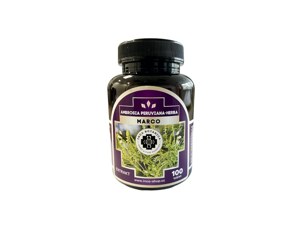 100% Marco (Ambrosia peruviana-herba). 1 tbl. 600 mg obsahuje mikrokrystalická celulóza (plnidlo), Marco (Ambrosia peruviana-herba) extrakt 160 mg, Hydroxypropylmetylcelulóza (stabilizátor), Stearan hořečnatý rostlinný (protispékavá látka)